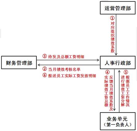 培训会上,各业务单元HR就该制度的主要考核流程作了详细讲解,首先运营管理部门提供对应的组织绩效系数至人事行政部门;其次,人事行政部门梳理并提供当月纳入考核人员名单至财务管理部门,由财务部门将其待发工资明细及总额统计后回传至人事行政部门;然后,人事行政部门将组织绩效系数与考核基数相乘后得到当月绩效工资实际发放总额,并发送至业务单元第一负责人进行分解;最后,业务单元第一负责人根据员工绩效考核结果将业务单元当月绩效工资实际发放工资总额分配至员工个人并回传至人事行政部门,人事行政部门最终汇总并提交财务部门实施发放。具体流程示意图如下: